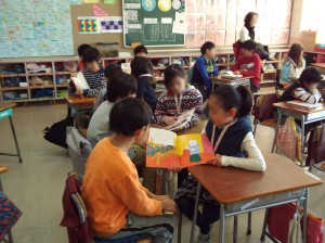 今日の5校時、2年生と4年生は、お互いが選んだお薦めの本を読みきかせ合う交流会を行いました。2年生の中でに、自分が読むので必死な子もいれば、きちんと聞かせる相手の4年生に体を向けて読んでいる子もいました。(杉本)