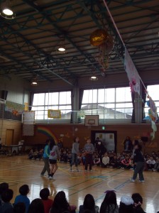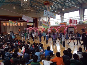 体育館の天井から吊るされたくす玉が割られ、6年生を全員で送り出します。花のアーチの下を通って歩く6年生の姿はとても凛々しく、表情は笑顔でいっぱいでした。3月25日の卒業式は、さらに大きな感動でいっぱいになるのでしょうね。(杉本)