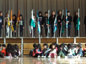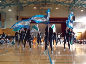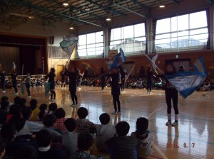 全員フラッグを持ち、音楽に合わせて規律正しく振りあげます。一糸乱れぬ演技に、全校生徒は息をひそめながらの見入っていました。この日まで、厳しい練習を積んできた部員のみなさんは、素敵な発表でした。(杉本)