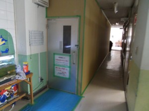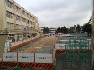 第二校舎の改修工事が始まりました。トイレのところに壁ができて、廊下が狭くなっています。校庭が半分使えなくなります。(杉本)