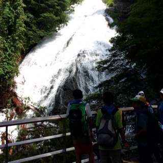 絶景、大迫力の湯滝を見学しました。グループで記念撮影パシャリ!