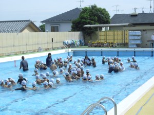 1年生は、水泳の授業が行われました。水に親しみながら、歌やダンスに合わせて楽しく活動していました(杉本)