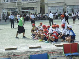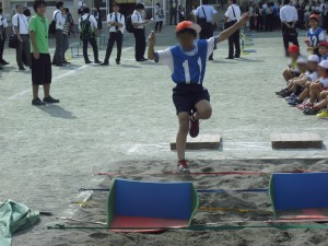 5年3組は、校庭で走り幅跳びです。子どもたちは、開発されたいろいろな教具を使って、何度も自分の記録に挑んでいました。(杉本)