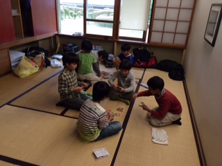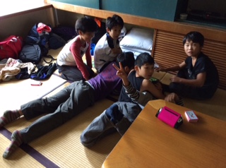 宿舎に入ると、早速避難訓練します。そしたら、しばらく自由時間。UNOしたり、コソコソ話ししたり…。
