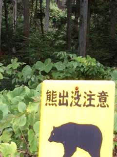 いよいよ、急な登り坂になります。ややっ!熊出没注意の看板の向こうに動くものが…。カメラマンでした。