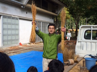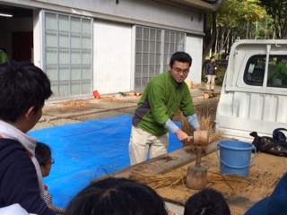わら縄は、わらを打つことから始めます。結構、力が入りますね。