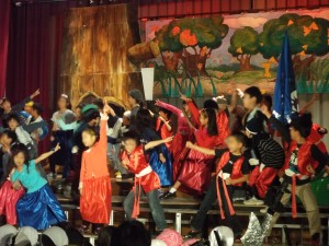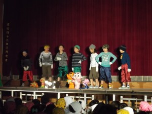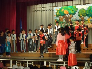 3年生の劇は、「まつばらウェストサイド物語」。対立するレッドイーグル団とブルーシャーク団の、2つのグループのテンポのやりとりが見事でした。最後は協力し、泥棒たちから仲間を助けようとします。(杉本)