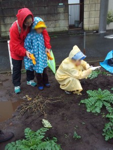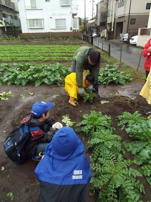 ともだち教室の月曜日のグループの子どもたちが、小雨のまじる中、大根抜きを体験しました。3・4年生がお手本となって、1年生に大根の抜き方を説明してくれました。大きな大根をお土産にして持ち帰りました。(杉本)