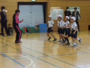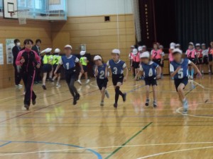 ウォームアップタイムでは、スキップやシンクロケンケンパ等、小型ハードルを走り越す時の口拍子につながるように、子どもたちで声をかけ合って取り組んでいます。(杉本)