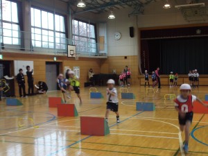 ランランタイムは、インターバルや小型ハードルの高さの異なる6つのコースを練習します。それぞれのコースの感想をチームで話し合い、走るリズムを意識できるようにしました。(杉本)