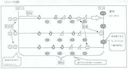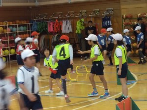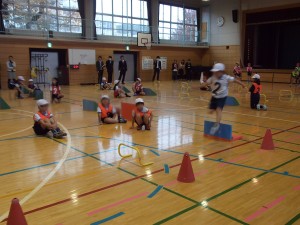 チャレンジタイムでは、(1)練習リレー→(2)作戦タイム→(3)本番リレーの流れで行い、学習に対する意欲を高めたり、楽しさを広げたりできるようにしています。作戦タイムでは、小型ハードルの横に集まって、どうしたら速く走れるかをチーム全員で話し合い、実際に試しながら作戦を考えていました。(杉本)