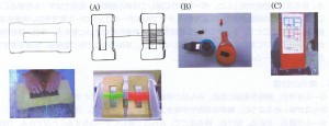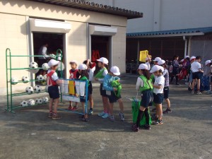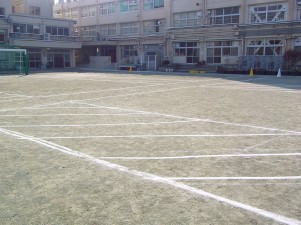 体育の授業の準備や片付けをより簡単に、より速やかに行うことができるように、本校の効率化の一つとして、教具・器具の開発や改良があります。今回は新たに児童だけでラインが引けるように、写真(A)のようなライン引き用の糸巻きを開発し、コートのポイントに合わせて、素早くコートの線が引けるようにしました。従来は、写真(B)のような墨つぼで方向を示してラインを引いていましたが、低学年には糸がピンと張れないなど扱いが難しいので、内側の空洞の部分に手を入れて、握れるようにして引っ張りやすくしました。