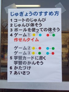 本時の流れやめあてを確認します。掲示物も子どもたちに見やすく工夫し、学習の見通しがもてるようにします。