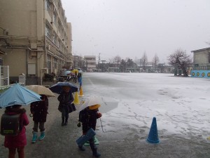 朝から雪となり、松原小学校の校庭は真っ白になりました。登校する子どもたちは、振り積もった雪を見ながら、うれしそうに歩いていました。手袋やマフラーなどの防寒対策をしっかりして、風邪をひかないようにしましょう(杉本)