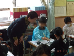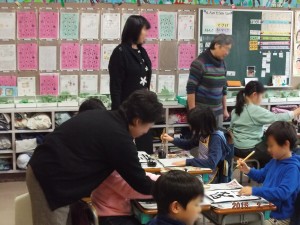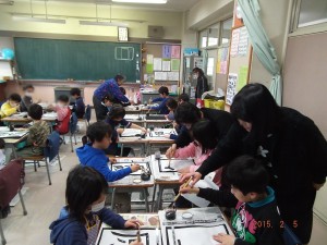2年生は、日本語の授業で毛筆にチャレンジしました。松原小学校で活動している書道サークルの方々のご協力のもと、初めてにしては堂々とした筆づかいで、とても立派な字が書けていました。(杉本)