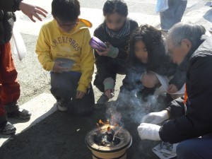3年生は昔の道具調べの学習で、地域の方々のご協力いただき、七輪を使って餅を焼くを体験しました。日常生活ではあまり使わなくなったマッチで火をつけ、七輪の炭に移して、家から持参したお餅を焼きました。寒空の下、炭火で焼いたあつあつのお餅は格別の味だったようで、どの子もおいしそうに食べていました。その後、お手伝いしていただいた地域の方々を各教室にご招待し、いっしょに給食を食べておもてなしをしました。(杉本)