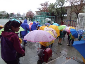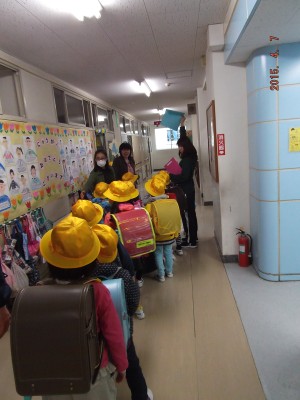 今日は1年生の初めての授業です。朝の準備や、挨拶の仕方、トイレの使い方等学校生活の基本的ルールの勉強をしました。下校時は雨が降っていたので、廊下でコースごとに並んで下校しました。(榊)