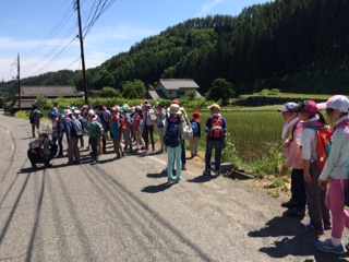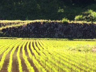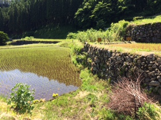 棚田(たなだ)です。斜面に田んぼを作るため、石垣を作り、水をはれるようにしています。丁度、田植えが終わったところですね。川場のお米は、「雪ほたか」というブランド米です。