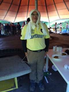 ブヨに頭を刺されないようにしています。カレーの匂い、いい匂いだなぁ。