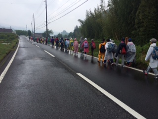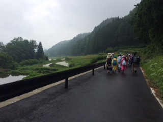 村巡りに出発します。レインコートを着ましたが、歩き出したら雨がやみました。ラッキーな子どもたち!