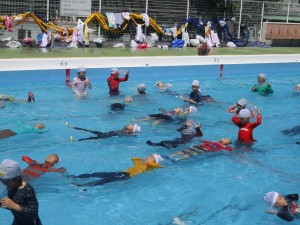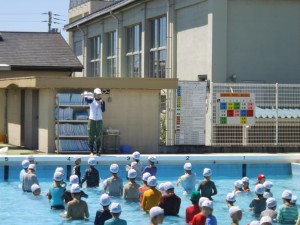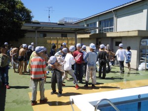プールで着衣泳を行いました。水を吸った服の重さを体感したり、ペットボトルを使って水に浮く練習をしたりしました。 (森)