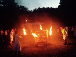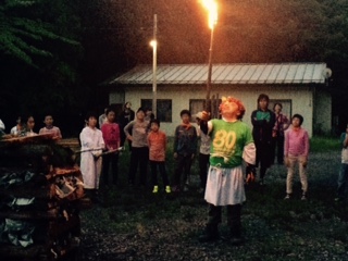 キャンプファイヤーが始まりました。今年の火の神は、matsubara80Tをまとって登場です。名前はサンシャイン(日光)マーツバーラエイティ。