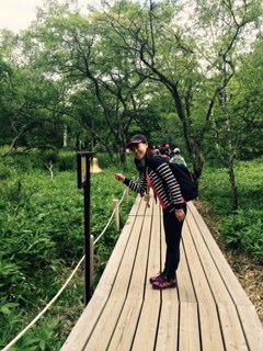 ところどころにオシャレな鐘が!ウエディングベル?…いいえ「人がいることを熊に知らせましょう」と書いてありました…。藤田先生、列から離れないように!