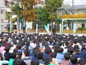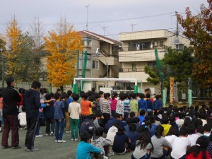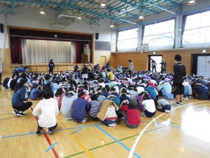 朝会時に地震が発生したという設定で避難訓練を行いました。(森)