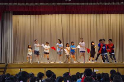 4年生は「ルパン・ザ・ファイヤー」を披露しました。双子のルパンとゼニガタ刑事が登場。ルパンは明日、松原小に参上するという予告状を残していきました。(真田)
