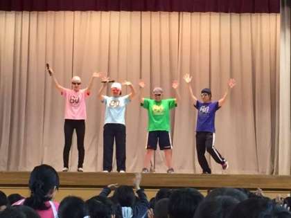 本日から水泳が始まります。 それを知ってか今日の全校朝会には、プーレンジャーが現れました!プーレンジャーは、みんながプールを安全に楽しむために3つのことを教えてくれました。