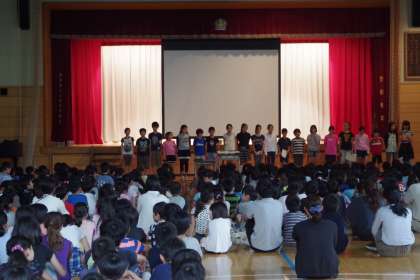 正しい手洗いの仕方や、マスクのつけ方についての説明は、クイズ形式になっており、低学年から高学年まで楽しく参加していました。