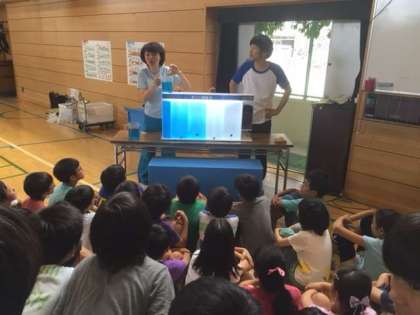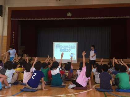 水道局の方々に来ていただき水道キャラバンが行われました。水が水道水源林から蛇口に辿り着くまでの旅の様子を楽しく分かりやすく教えていただきました。水道キッドのお土産をいただいたので家で実験するのが楽しみ!!(細川)