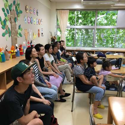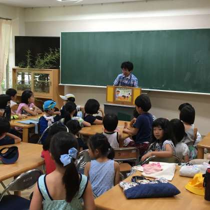次は紙芝居です。保護者の方々もたくさん参加してくれています。(副校長 久野浩誉)