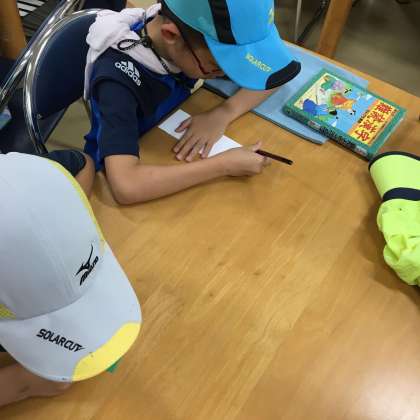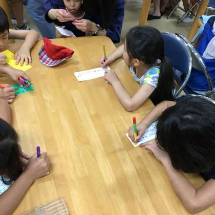 短冊に願いごとを書いています。これからこれを笹に取りつけます。(副校長 久野浩誉)