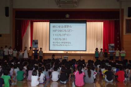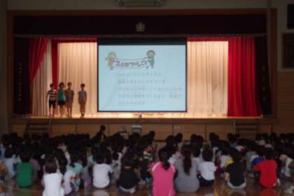 代表委員が、世界の子供たちの様子を紹介しながら、ユニセフ募金が貧しい国の子どもを救うための募金だということを、全校児童に伝えました。