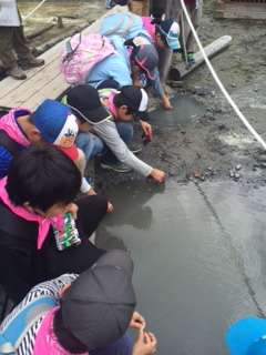 最初は、温泉のにおいを気にしていた子たちも、今や温泉に浸すことに熱中しています。(志村有香)