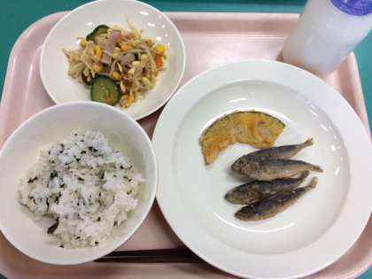 わかめごはん、牛乳、かぼちゃの天ぷら、豆アジの唐揚げ、豆モヤシの中華サラダ