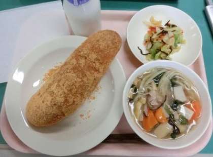 学校給食の定番メニューのあげぱん。今日はいつもの紙ナフキンの代わりに揚げ物袋を配りました。これに入れて食べたほうが油もしみることなく、きなこも袋の中に落ちるので、食べやすかったようです。また、明日葉を生地に練りこんだうどんを使った具だくさんのとろみ汁も大好評でした。