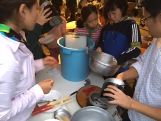 ごちそうさまの後は片付けです。ススやカレーは落ちにくい。次に使う人のことを考えて、心を込めて洗います。