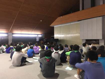 雨のため、キャンプファイヤーは延期です。これからおもてなしレクをおこないます。全15グループが各5分、全力で笑わせてくれます。(真田)