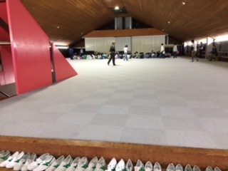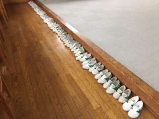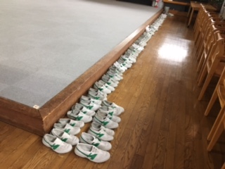 ふじやまビレジには、「村の会堂」という、とにかく広い室内広間があります。ここに集合して部屋ごとの出し物です。それにしてもこの上履きの揃え方。ジス イズ マツバラ スタイル サンキュー。