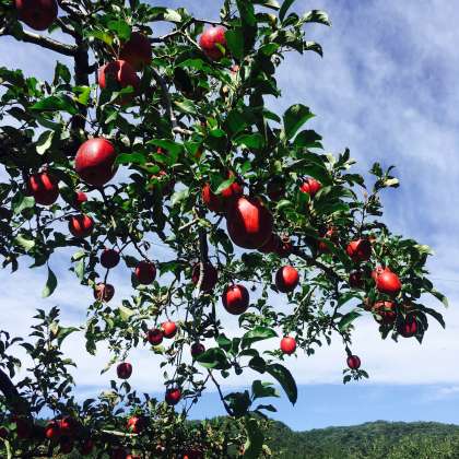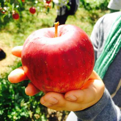 どのりんごが一番美味しそうかな。一番綺麗かな。一番大きいかな。皆自分が思う一番「いいりんご」をもぎっと取り、大事そうにリュックにしまいます。美しく、おいしく、思い出のつまったお土産を収穫しました。(真田)