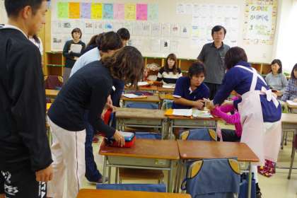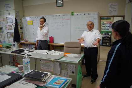 実際に起こりうるケースを想定し、演習を行います。職員室では現場からの連絡を受け、校長から職員へ指示が出されます。現場では、対象児童の対応をします。(真田)