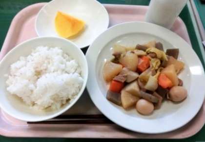 今日の主菜は、豚肉と大根、こんにゃく、にんじん、さといも、はくさい、うずらの卵が入ったうま煮でした。カツオの和風だし、さとう、しょう油などで煮ているのですが、はじめにしょうがとにんにくで炒めてから煮ているので、中華風な味のする煮ものです。子どもたちはよく食べていました。