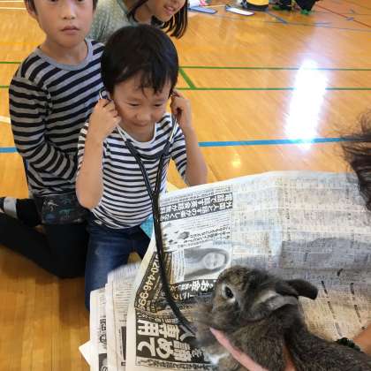 今回も、獣医さんの手ほどきにより、イヌ、ウサギの心音を聴くことができました。その違いに子どもたちは驚いていました。