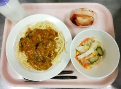 東京都の伊豆諸島でとれる飛魚をミンチにしたものをそぼろ状に炒めてカレー味のソースに仕上げました。言わなければひき肉だと思って食べている子どもがほとんどでした。この時期限定の紅玉を使ったデザート「焼きりんご」も大好評でした。サラダもよく食べていて、今日は全体の残食がとても少なく、嬉しく思いました。