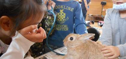 11月10日5校時に、1年生の動物ふれあい体験が行われました。1,2組の子どもたちが、うさぎや犬に直接さわったり、聴診器で心臓の音を聴いたりしました。
