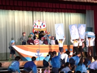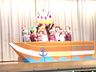 一年生の劇は、お菓子が大好きな海賊のお話です。私もチョコとおせんべいが大好き!海賊にいーれーて!