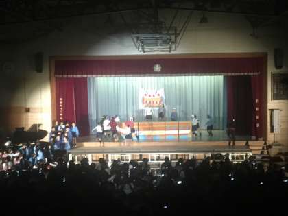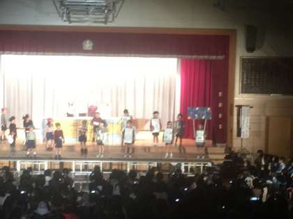おかしが大好きな海賊たちがおかしを求めて旅に出ます。恐竜やロボット、海賊の役など衣装だけでなく声の出し方や速さを工夫して演じています。春に入学した1年生、この数ヶ月でとてもしっかりしたように見えます。約半年後、2年生になり新しく入ってくる1年生を迎える準備がすでにはじまっているのかもしれません。(真田)