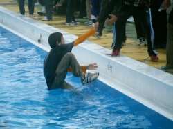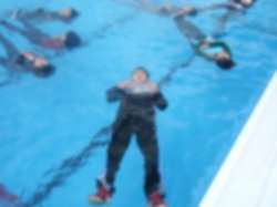 はじめに衣服や靴をはいたまま、クロールと平泳ぎで泳いでいました。